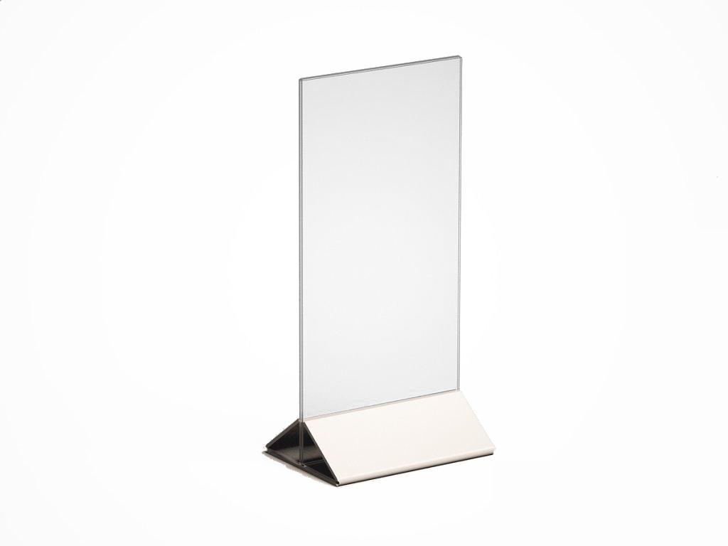 МЕНЮХОЛДЕР ФОРМАТА 1/3 А-4, С НИЖНЕЙ ЧАСТЬЮ РАЗЛИЧНЫХ ЦВЕТОВ, КЛАСИЧЕСКОГО ВИДА. СОСТОИТ ИЗ ДВУХ ЧАСТЕЙ, ПРОЗРАЧНОГО ПЛАНШЕТА ИЗ ОРГСТЕКЛА И НИЖНЕГО ДЕРЖАТЕЛЯ, ТРЕУГОЛЬНОЙ ФОРМЫ ИЗ ЦВЕТНОГО ПОЛИСТИРОЛА.