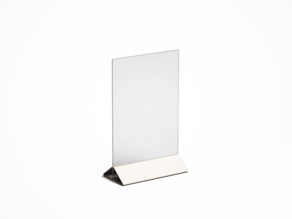 МЕНЮХОЛДЕР ФОРМАТА А-5, С НИЖНЕЙ ЧАСТЬЮ РАЗЛИЧНЫХ ЦВЕТОВ, КЛАСИЧЕСКОГО ВИДА. СОСТОИТ ИЗ ДВУХ ЧАСТЕЙ, ПРОЗРАЧНОГО ПЛАНШЕТА ИЗ ОРГСТЕКЛА И НИЖНЕГО ДЕРЖАТЕЛЯ, ТРЕУГОЛЬНОЙ ФОРМЫ ИЗ ЦВЕТНОГО ПОЛИСТИРОЛА.
