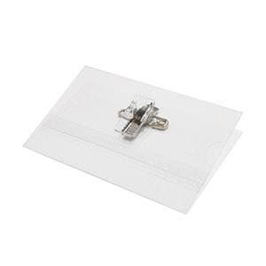 Выполнен из плотного прозрачного пластика, на задней стороне металлический зажим и дополнительное крепление, булавка.