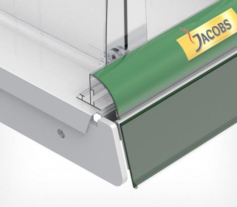 Используется передний профиль с ценникодержателем. Высота рекламной вставки - 30 мм. Имеет Т-профиль для крепления разделителей и толкателей. Крепится на полку на двухсторонний скотч.
