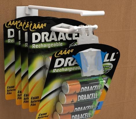 Противокражное устройство защищает товары, размещенные на двойных крючках. HOOK-GUARD оснащен по бокам кнопками, которые не дают за один раз снять с крючка больше одной упаковки. При снятии покупатель использует обе руки, что служит дополнительной защитой, не давая возможности ворам легко и быстро забрать товар. HOOK-GUARD не потеряется, он надежно крепится к крючку. HOOK-GUARD не является ценникодержателем.