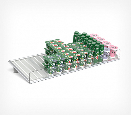 Основная часть полки - роллерное полотно, по которому продукты перемещаются к краю полки. Легко устанавливается на полку стеллажа и проста в обслуживании.
