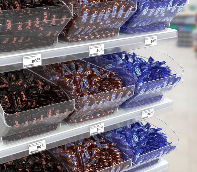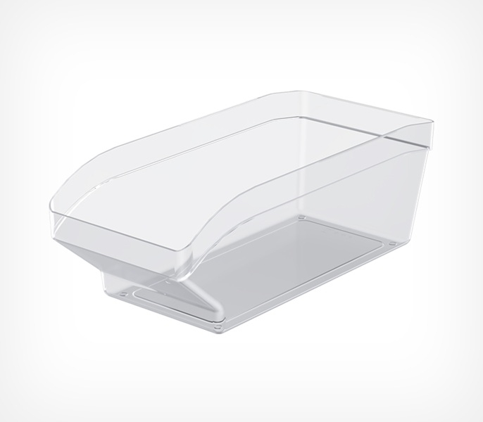 Контейнер SPACEBOX применяется для размещения и удобной выкладки развесных и мелких продуктов на прямых и наклонных полках торгового оборудования