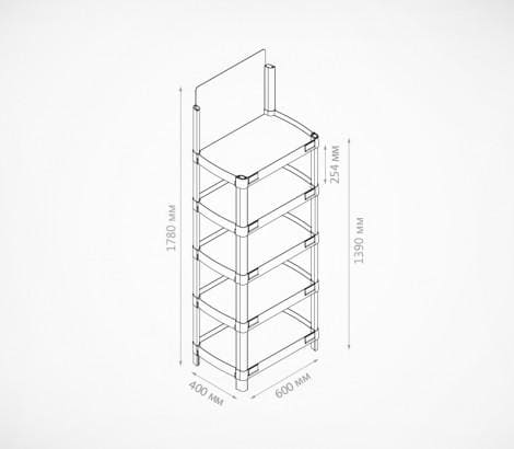 В комплект входит: 5 полок, 18 опор, 4 ножки, 1 топер, 10 ценникодержателей DBR-39 длина 70мм., 1 инструкция по сборке.